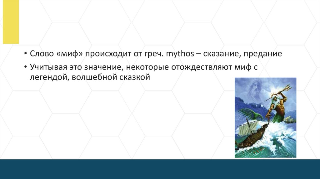 • Слово «миф» происходит от греч. mythos – сказание, предание• Учитывая это значение, некоторые отождествляют миф с