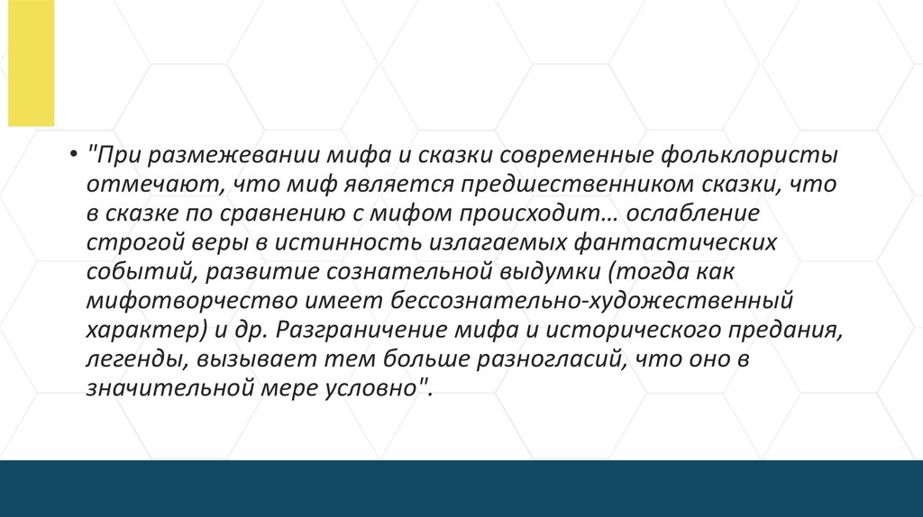• "При размежевании мифа и сказки современные фольклористыотмечают, что миф является предшественником сказки, что