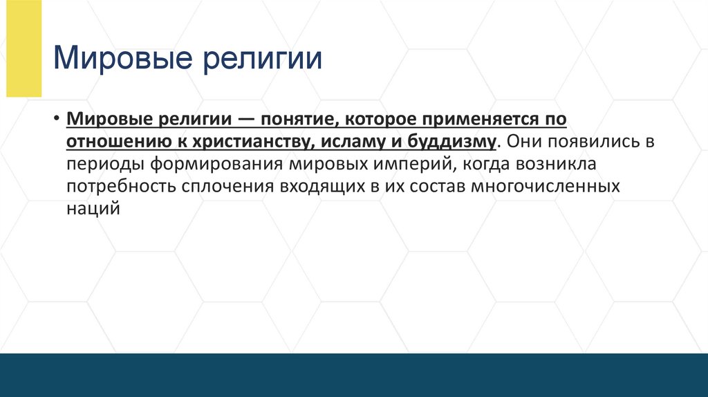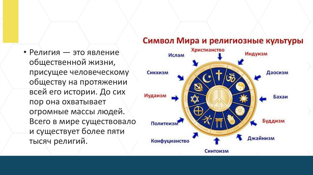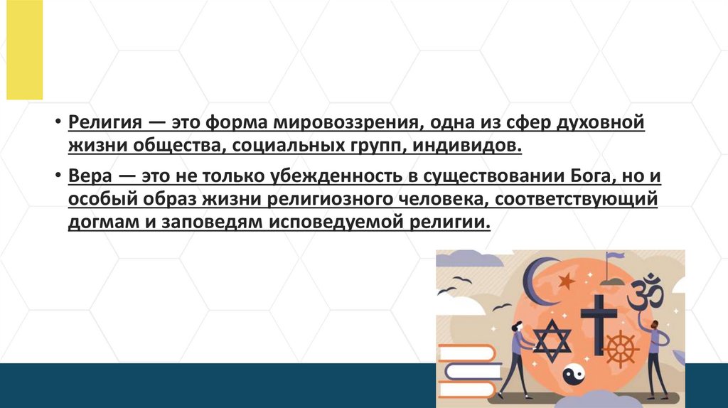 • Религия — это форма мировоззрения, одна из сфер духовнойжизни общества, социальных групп, индивидов.