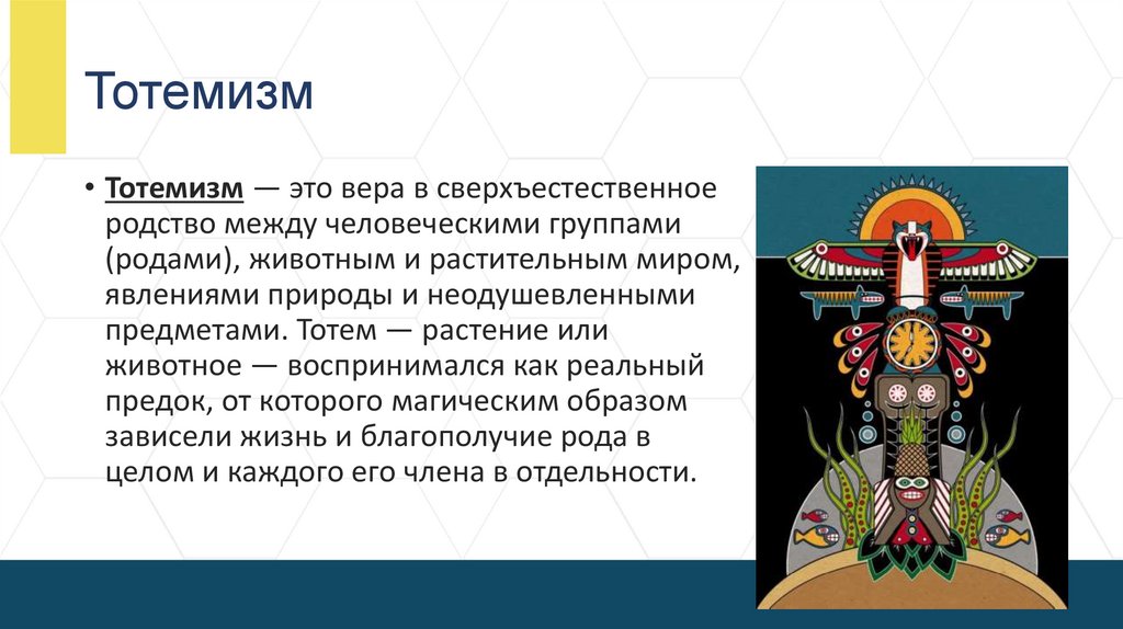 Тотемизм• Тотемизм — это вера в сверхъестественное