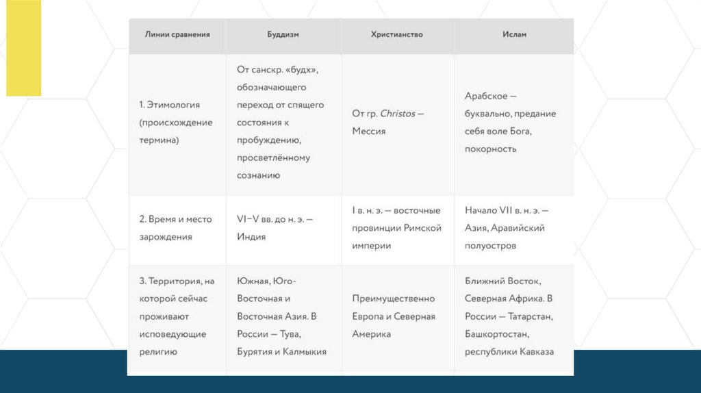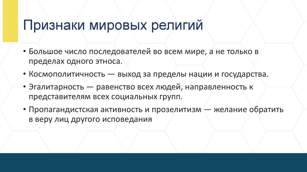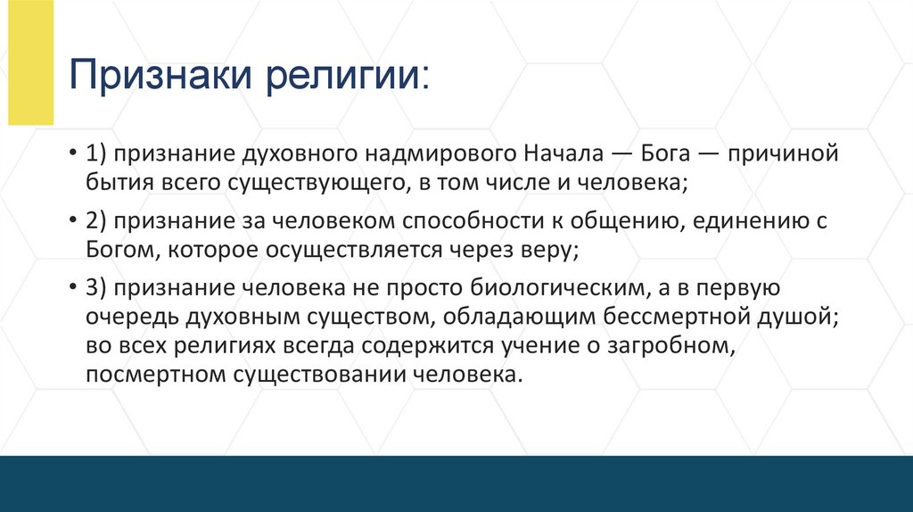 Признаки религии:• 1) признание духовного надмирового Начала — Бога — причиной