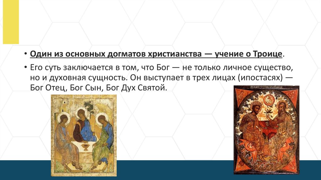 • Один из основных догматов христианства — учение о Троице.• Его суть заключается в том, что Бог — не только личное существо,