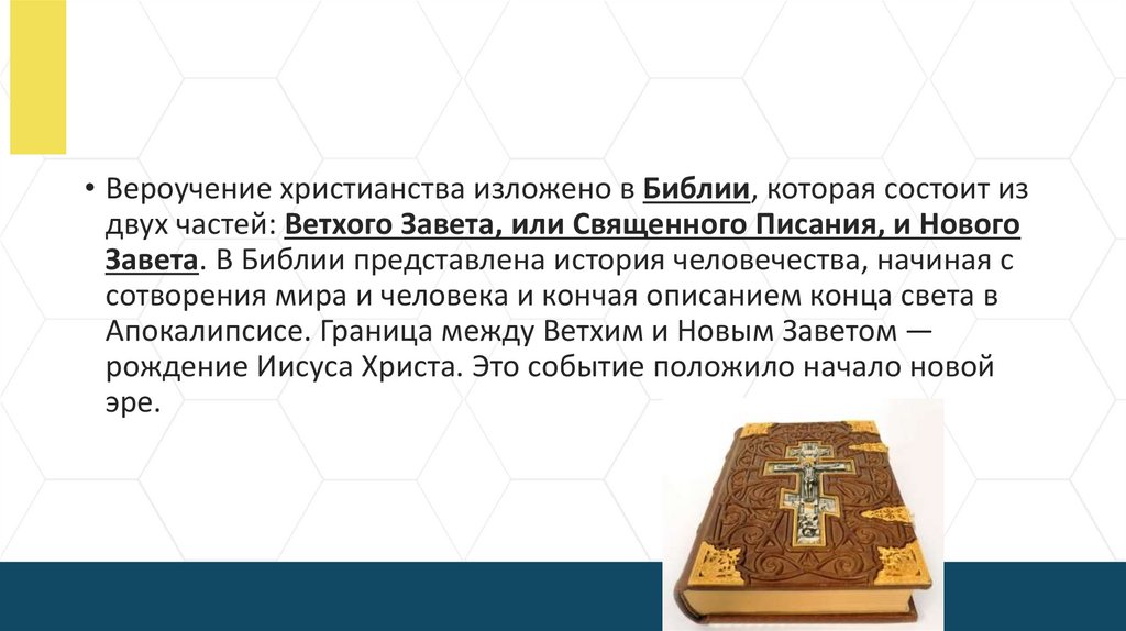 • Вероучение христианства изложено в Библии, которая состоит издвух частей: Ветхого Завета, или Священного Писания, и Нового