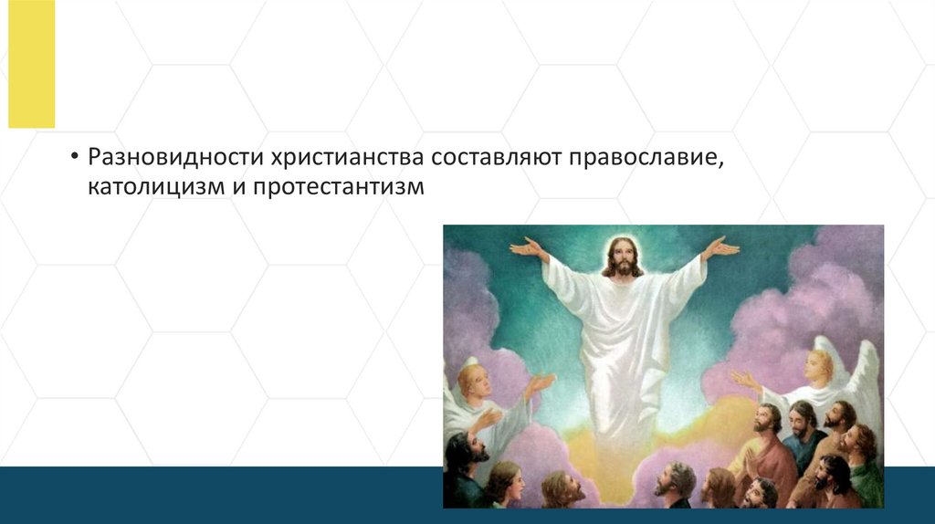 • Разновидности христианства составляют православие,католицизм и протестантизм