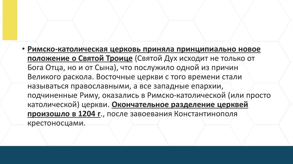 • Римско-католическая церковь приняла принципиально новоеположение о Святой Троице (Святой Дух исходит не только от