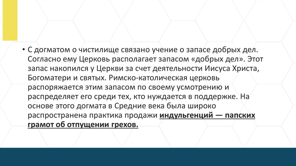 • С догматом о чистилище связано учение о запасе добрых дел.Согласно ему Церковь располагает запасом «добрых дел». Этот