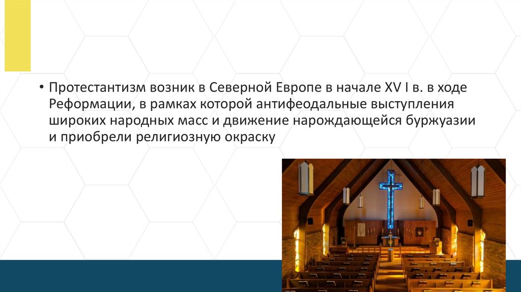 • Протестантизм возник в Северной Европе в начале XV I в. в ходеРеформации, в рамках которой антифеодальные выступления