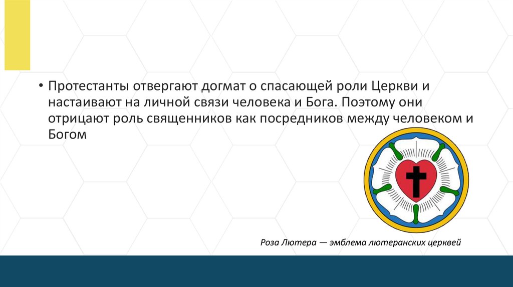 • Протестанты отвергают догмат о спасающей роли Церкви инастаивают на личной связи человека и Бога. Поэтому они