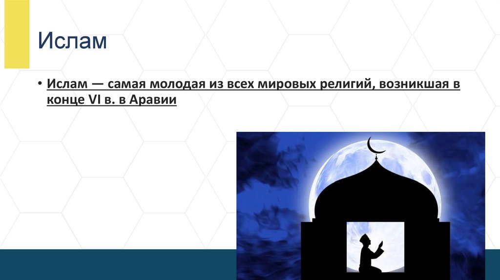Ислам• Ислам — самая молодая из всех мировых религий, возникшая в