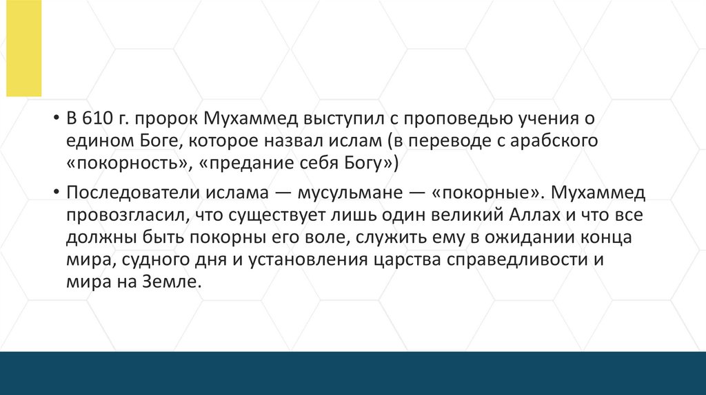• В 610 г. пророк Мухаммед выступил с проповедью учения оедином Боге, которое назвал ислам (в переводе с арабского