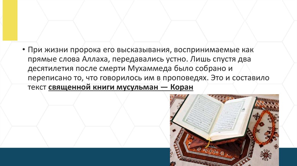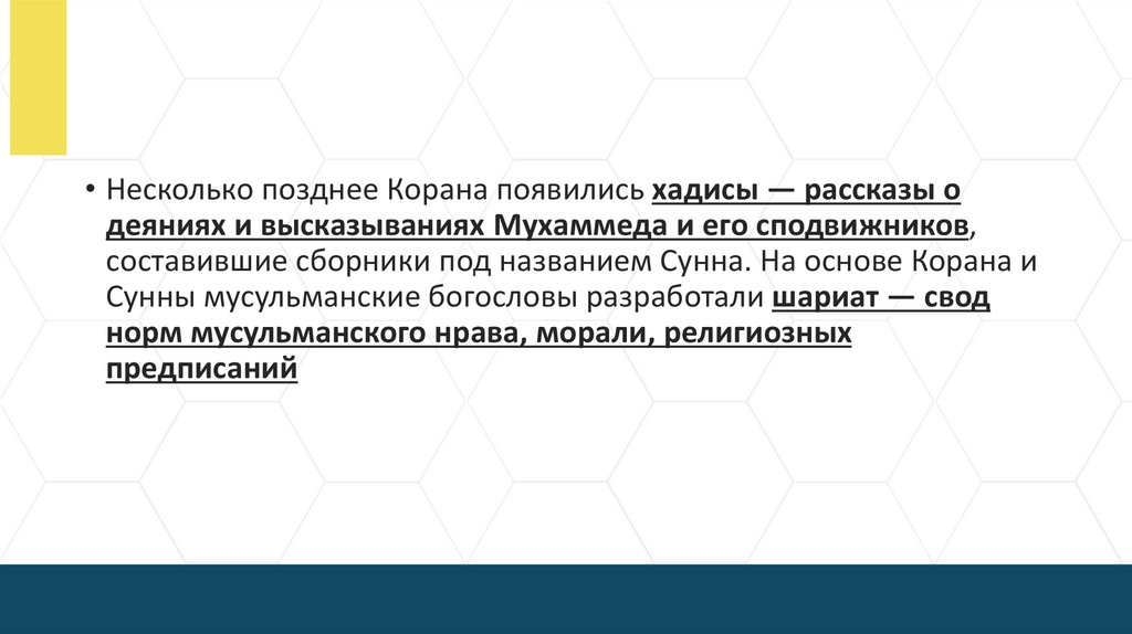 • Несколько позднее Корана появились хадисы — рассказы одеяниях и высказываниях Мухаммеда и его сподвижников,