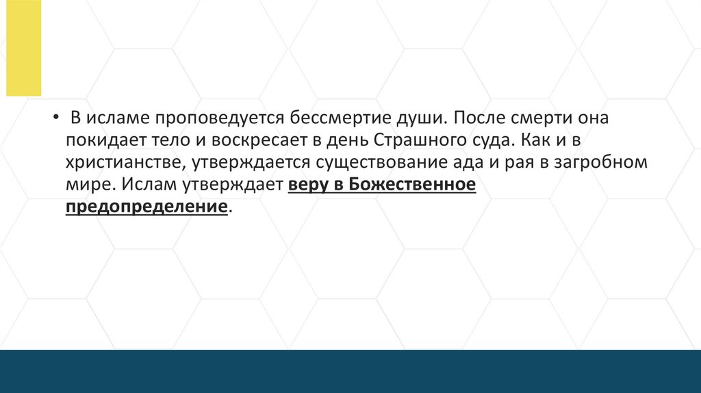 • В исламе проповедуется бессмертие души. После смерти онапокидает тело и воскресает в день Страшного суда. Как и в
