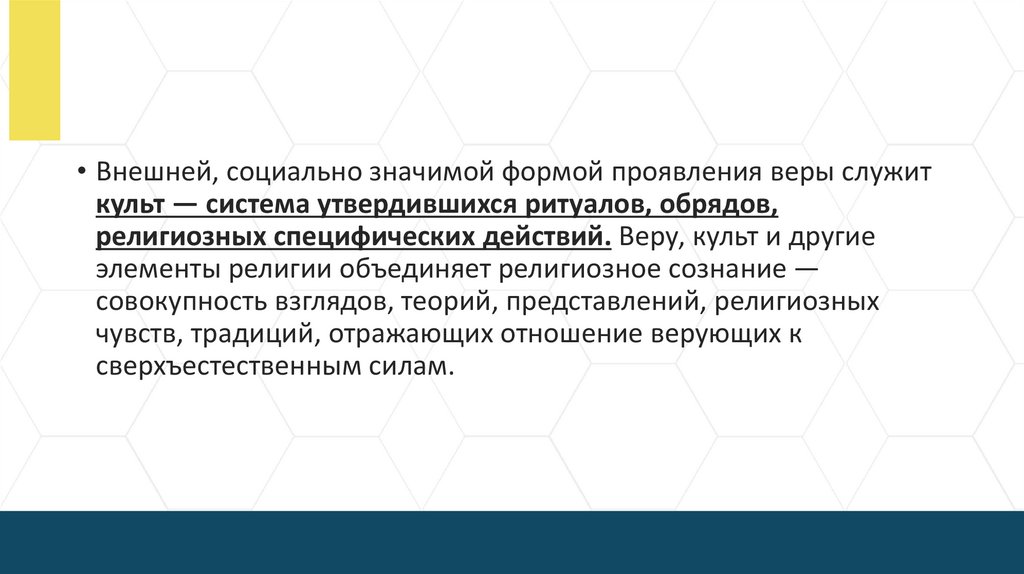 • Внешней, социально значимой формой проявления веры служиткульт — система утвердившихся ритуалов, обрядов,