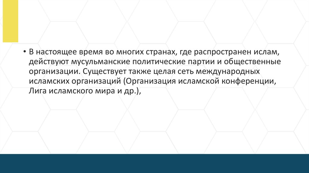 • В настоящее время во многих странах, где распространен ислам,действуют мусульманские политические партии и общественные