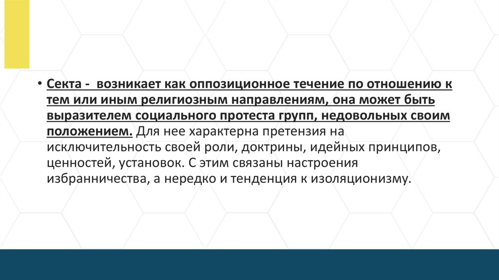 • Секта - возникает как оппозиционное течение по отношению ктем или иным религиозным направлениям, она может быть