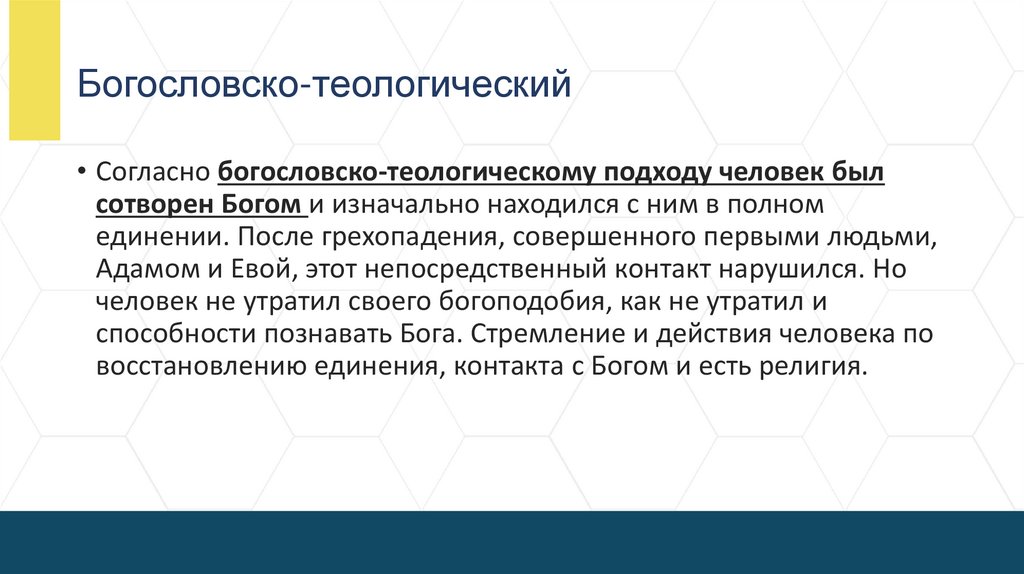 Богословско-теологический• Согласно богословско-теологическому подходу человек был