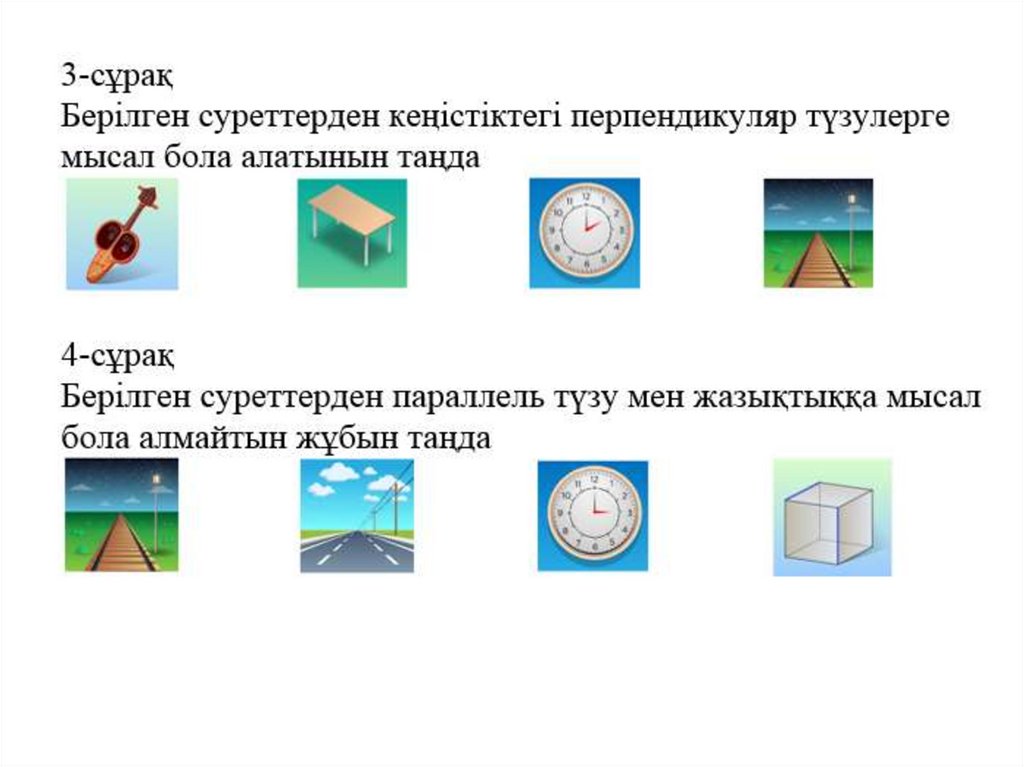 • кеңістіктегі түзулерді анықтай алады;• перпендикуляр түзулердің қасиеттерін есеп