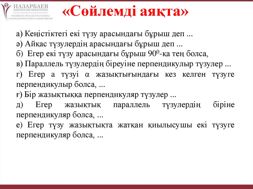 «Сөйлемді аяқта»а) Кеңістіктегі екі түзу арасындағы бұрыш деп ...