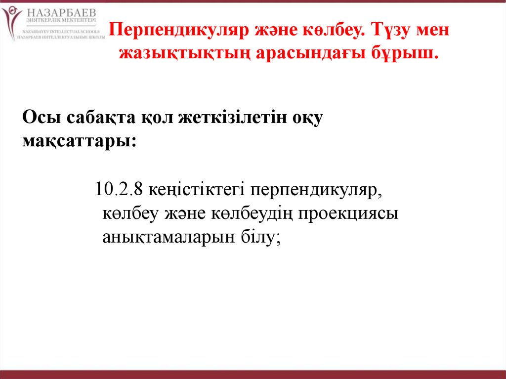 Геометрия 10 сынып, Перпендикуляр және көлбеу. Түзу мен жазықтықтың арасындағы бұрыш. Презентация