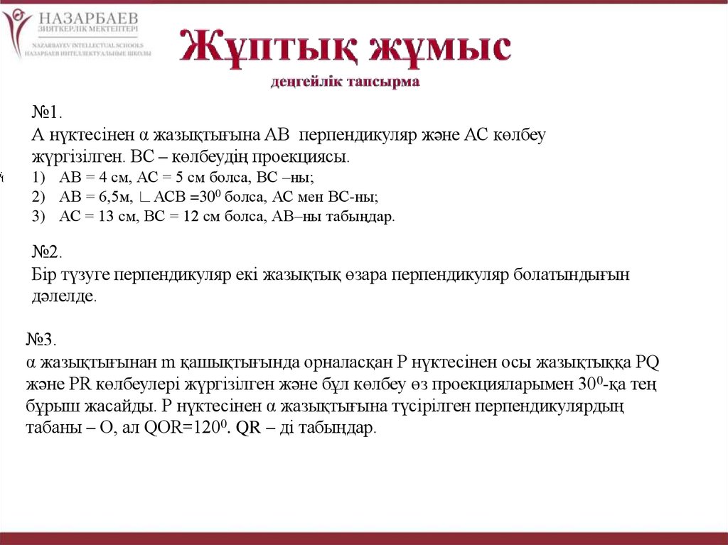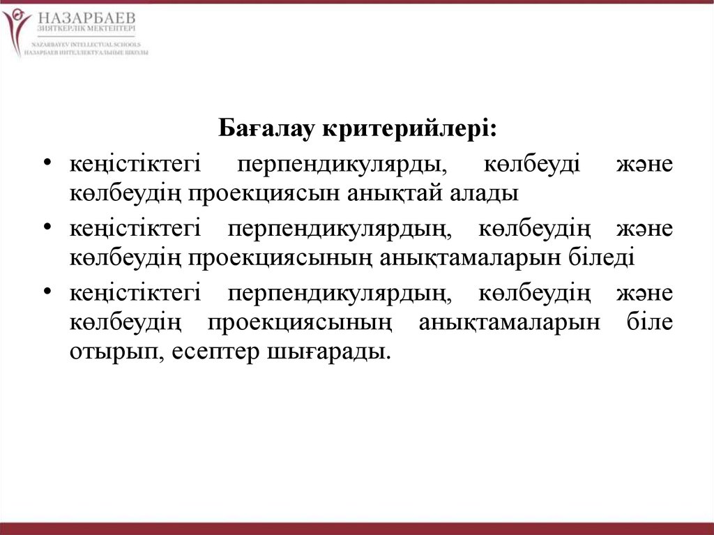 Бағалау критерийлері:• кеңістіктегі перпендикулярды, көлбеуді және