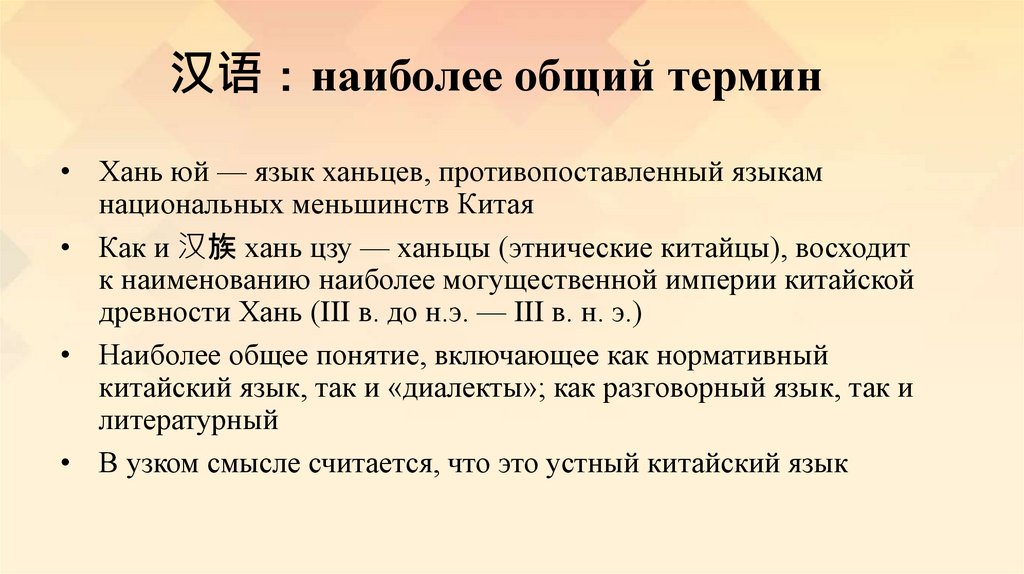 汉语 наиболее общий термин• Хань юй — язык ханьцев, противопоставленный языкам