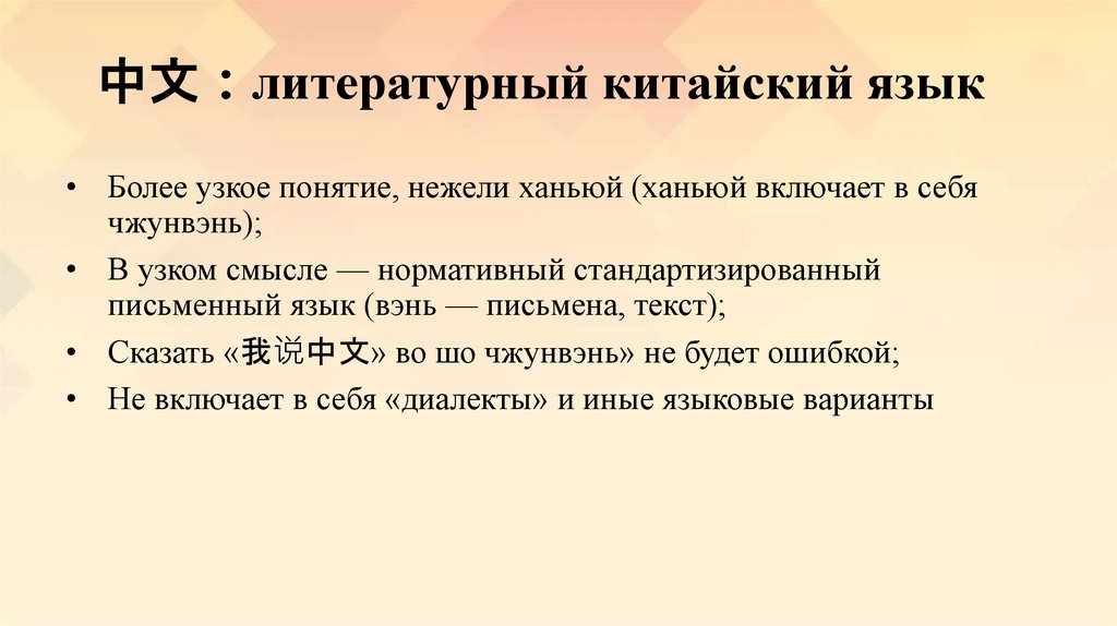 中文 литературный китайский язык• Более узкое понятие, нежели ханьюй (ханьюй включает в себя