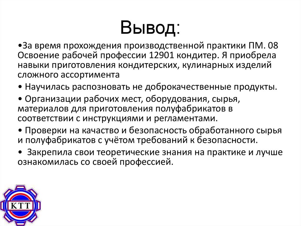 Вывод:•За время прохождения производственной практики ПМ. 08