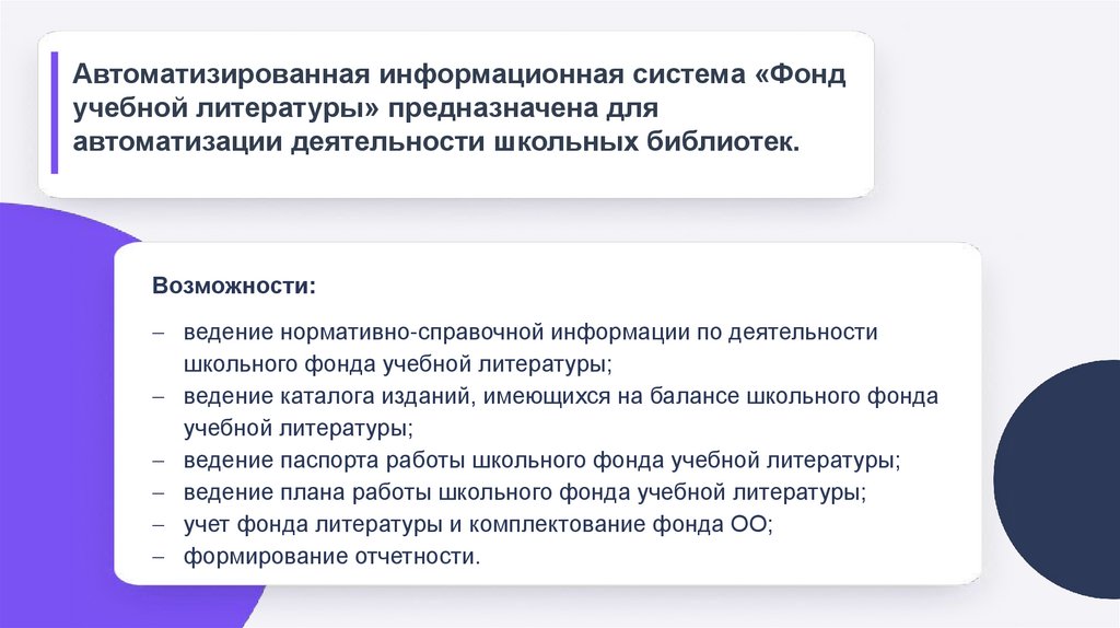 Автоматизированная информационная система «Фондучебной литературы» предназначена для