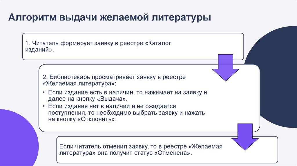 Алгоритм выдачи желаемой литературы1. Читатель формирует заявку в реестре «Каталог