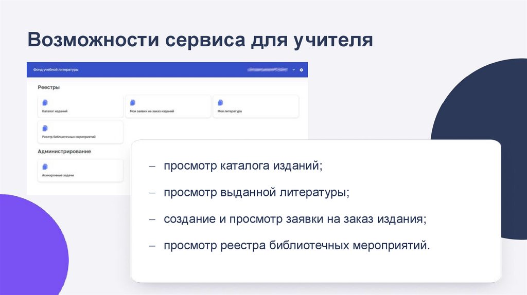 Возможности сервиса для учителяпросмотр каталога изданий;