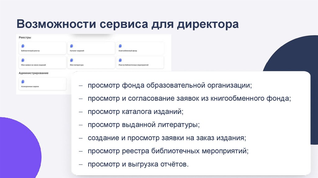Возможности сервиса для директорапросмотр фонда образовательной организации;