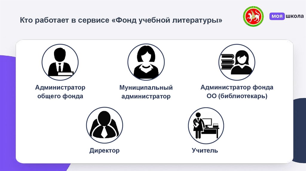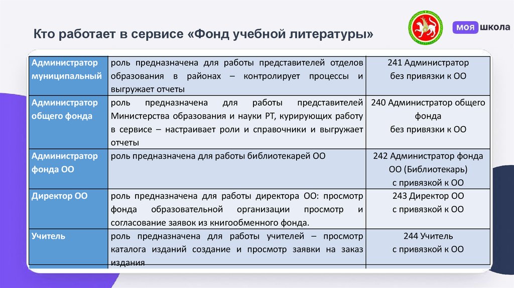 Кто работает в сервисе «Фонд учебной литературы»Администратор роль предназначена для работы представителей отделов