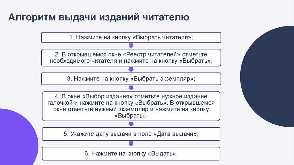 Алгоритм выдачи изданий читателю1. Нажмите на кнопку «Выбрать читателя»;