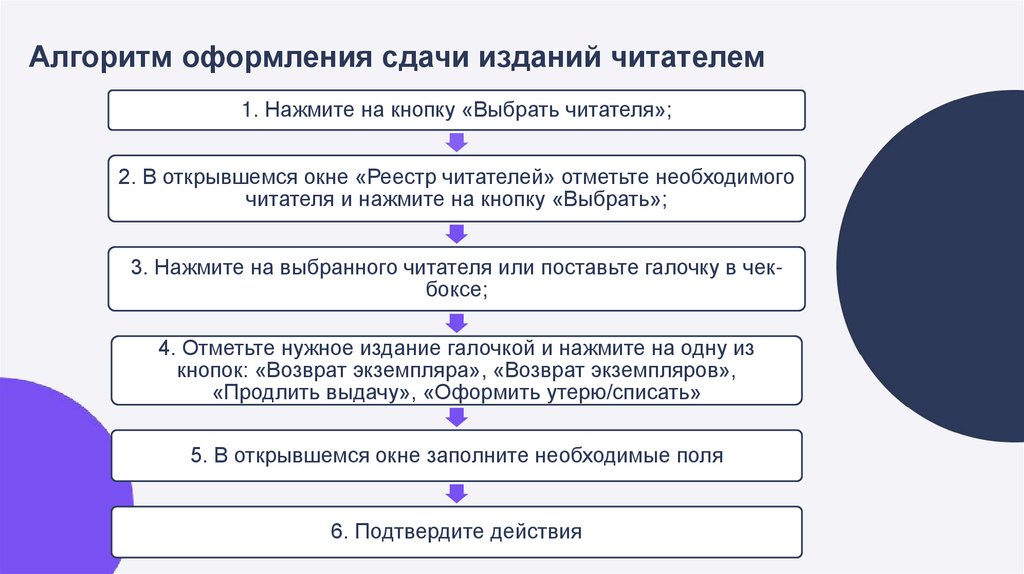 Алгоритм оформления сдачи изданий читателем1. Нажмите на кнопку «Выбрать читателя»;