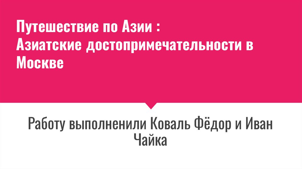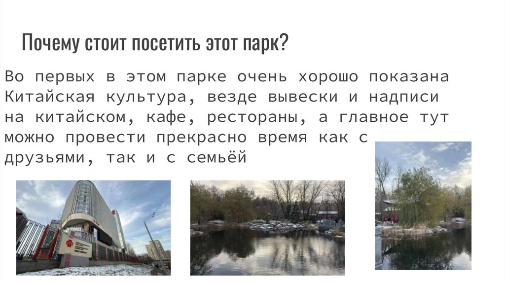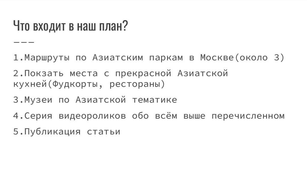 Что входит в наш план?1.Маршруты по Азиатским паркам в Москве(около 3)