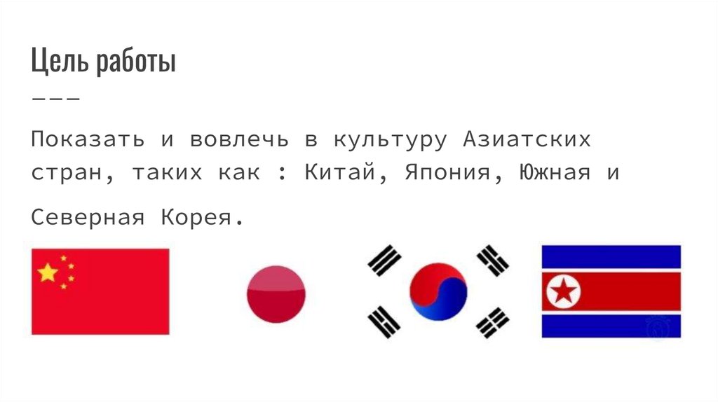 Цель работыПоказать и вовлечь в культуру Азиатских