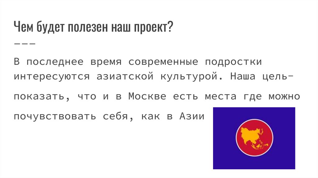 интересуются азиатской культурой. Наша цельпоказать, что и в Москве есть места где можно