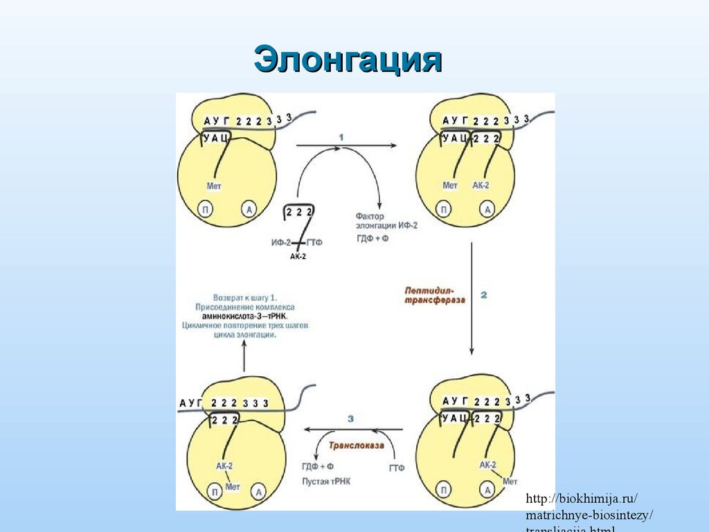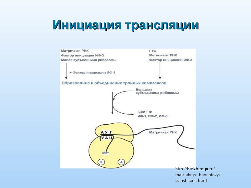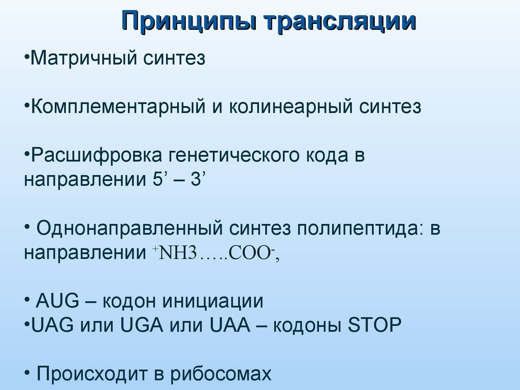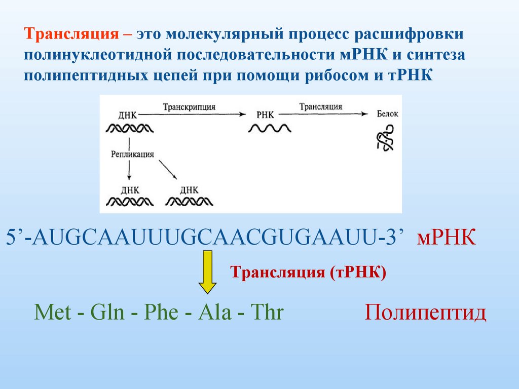Трансляция – это молекулярный процесс расшифровкиполинуклеотидной последовательности мРНК и синтеза