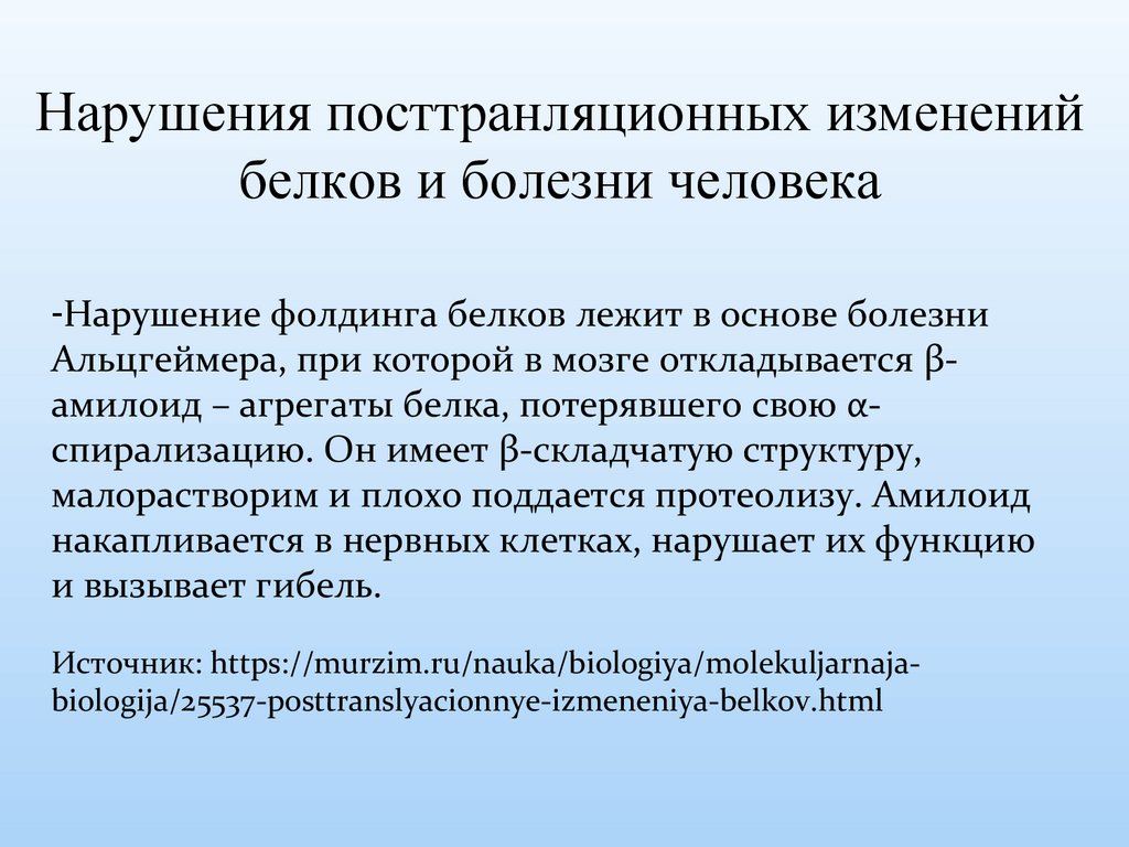 Альцгеймера, при которой в мозге откладывается βамилоид – агрегаты белка, потерявшего свою αспирализацию. Он имеет β-складчатую структуру,