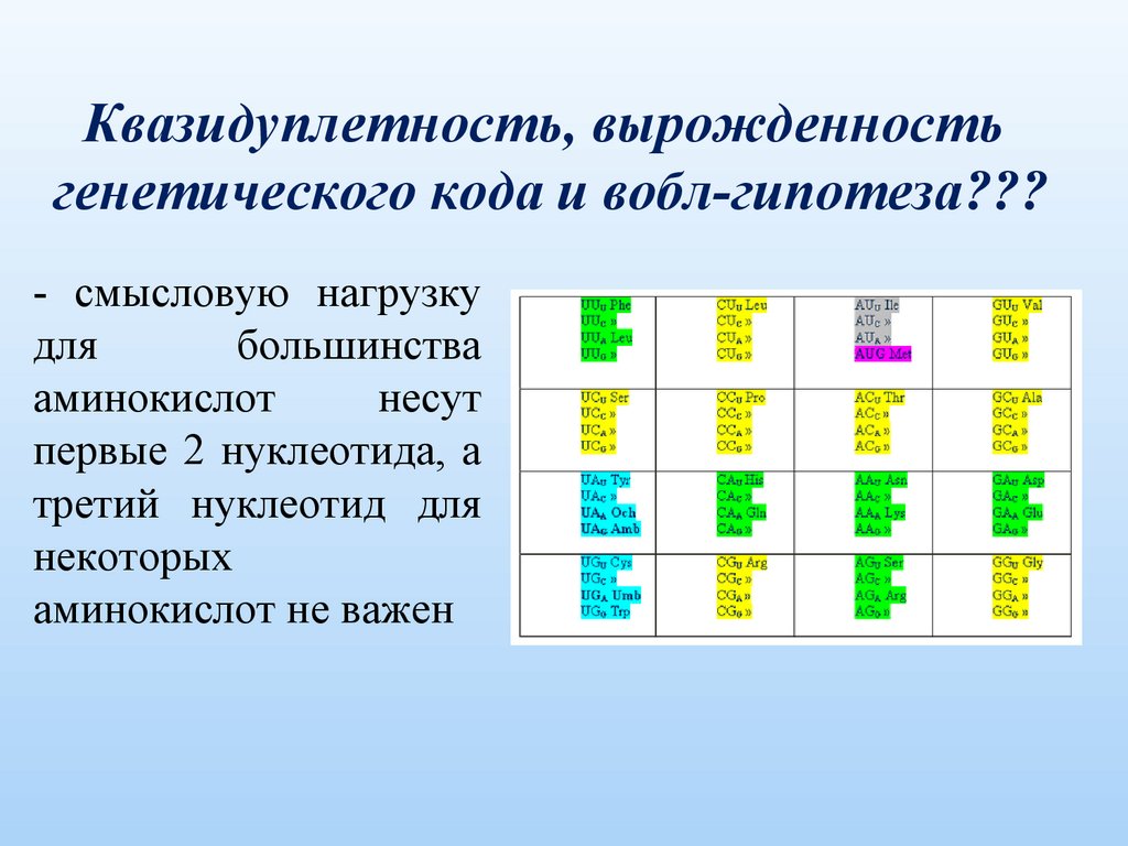 Квазидуплетность, вырожденностьгенетического кода и вобл-гипотеза???