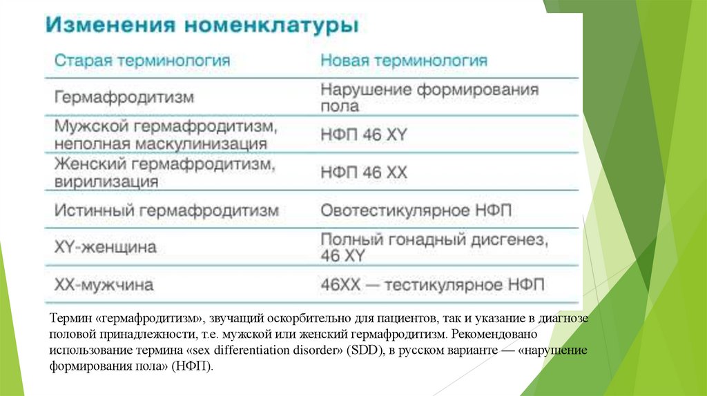 Термин «гермафродитизм», звучащий оскорбительно для пациентов, так и указание в диагнозеполовой принадлежности, т.е. мужской или женский гермафродитизм. Рекомендовано