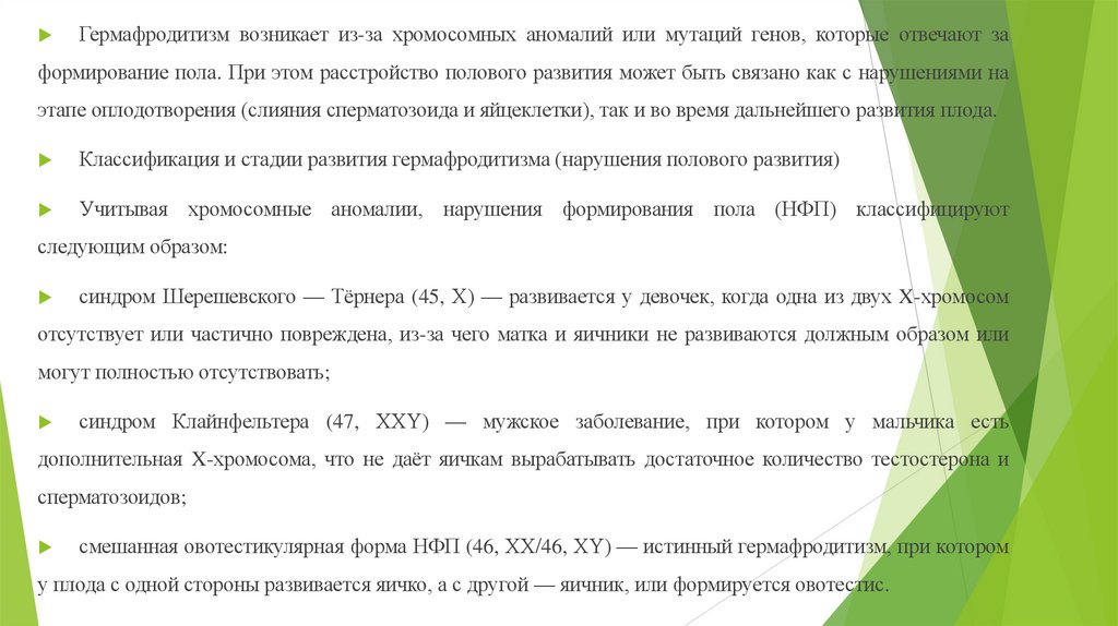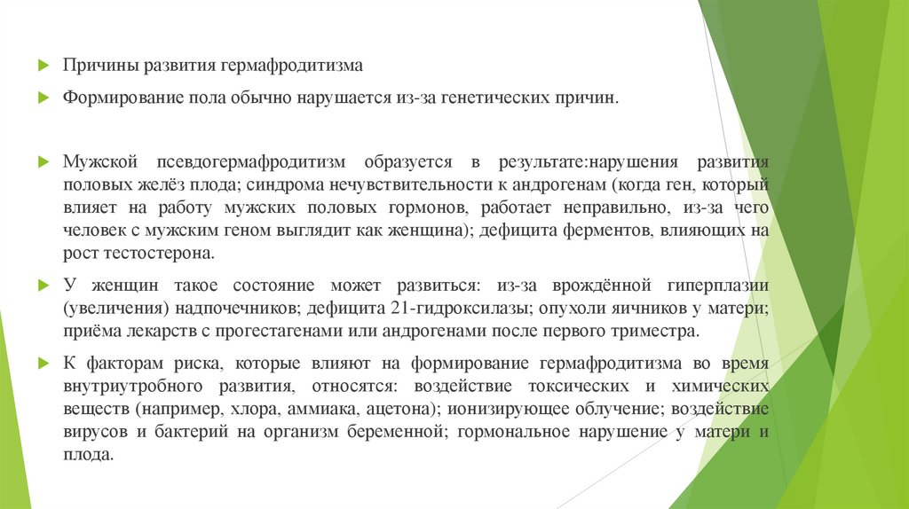 Причины развития гермафродитизмаФормирование пола обычно нарушается из-за генетических причин.