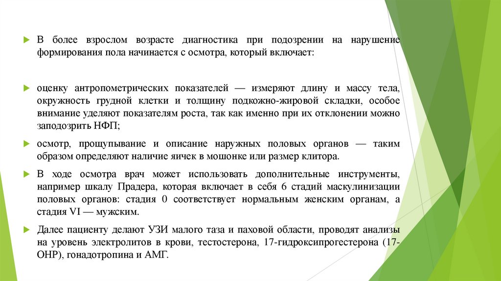 В более взрослом возрасте диагностика при подозрении на нарушениеформирования пола начинается с осмотра, который включает: