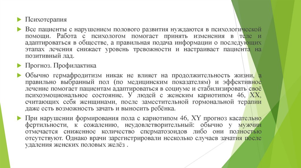 ПсихотерапияВсе пациенты с нарушением полового развития нуждаются в психологической