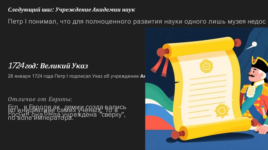 Следующий шаг: Учреждение Академии наукПетр I понимал, что для полноценного развития науки одного лишь музея недос