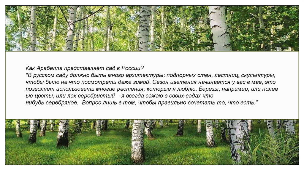 Как Арабелла представляет сад в России?"В русском саду должно быть много архитектуры: подпорных стен, лестниц, скульптуры,