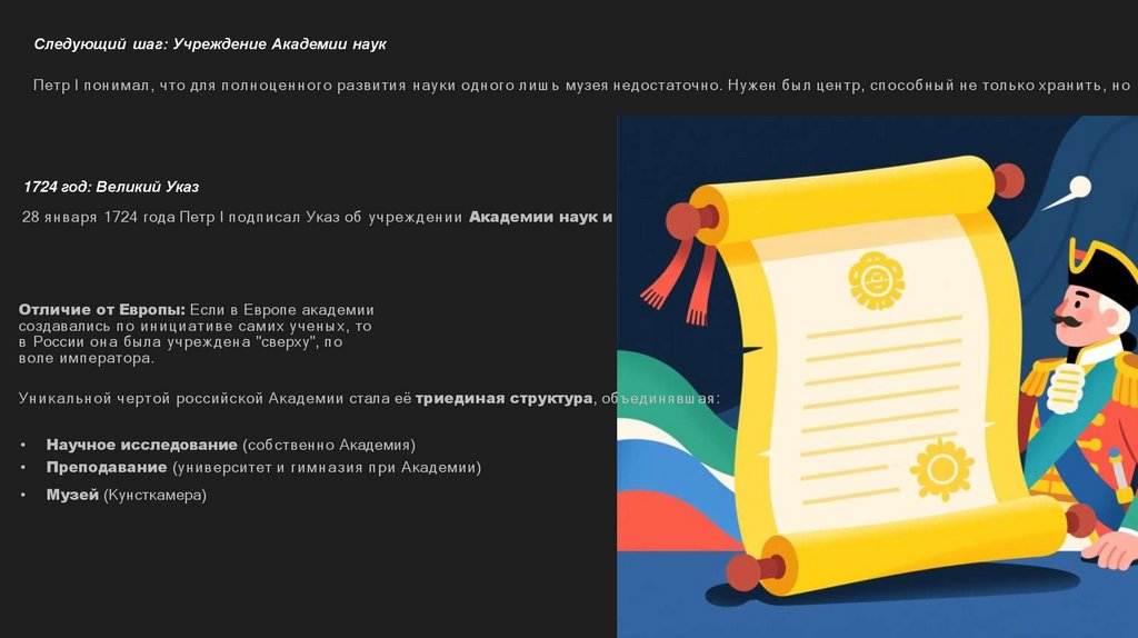 Следующий шаг: Учреждение Академии наукПетр I понимал, что для полноценного развития науки одного лишь музея недостаточно. Нужен был центр, способный не только хранить, но