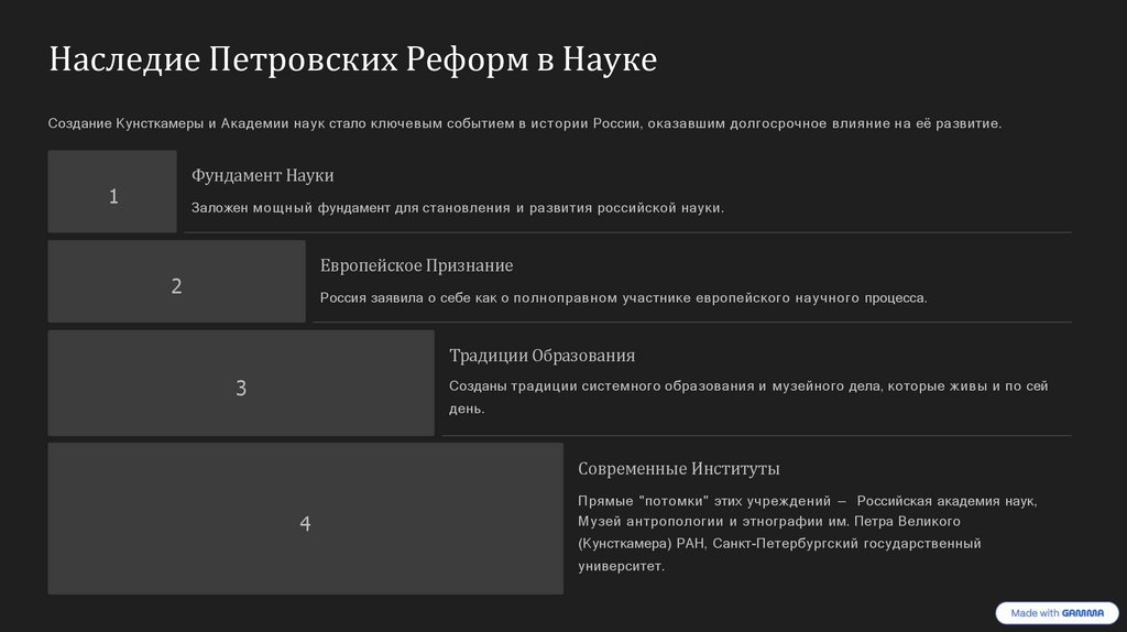 Наследие Петровских Реформ в НаукеСоздание Кунсткамеры и Академии наук стало ключевым событием в истории России, оказавшим долгосрочное влияние на её развитие.