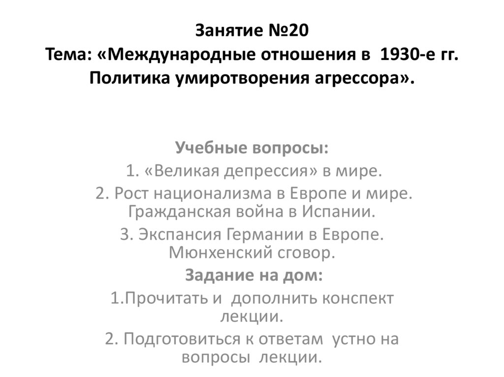 1. Занятие №20 Тема: «Международные отношения в 1930-е гг. Политика умиротворения агрессора».