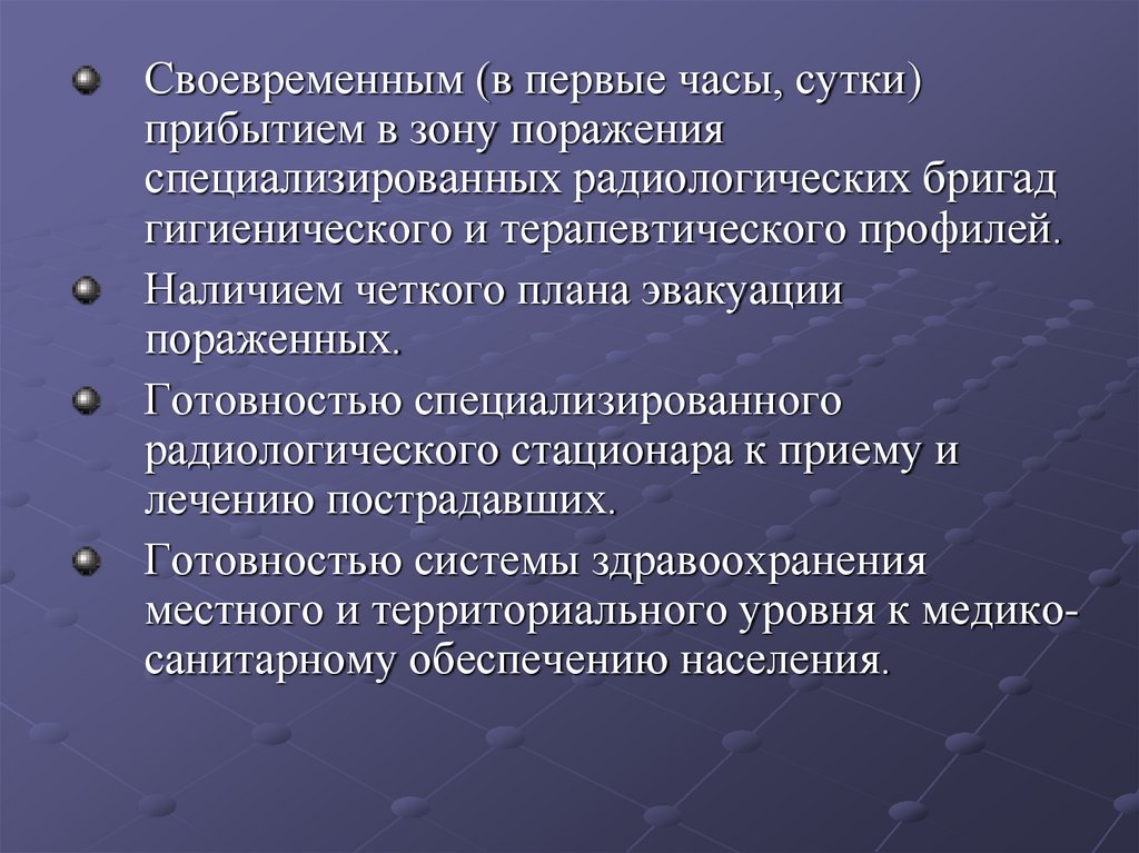 Своевременным (в первые часы, сутки)прибытием в зону поражения